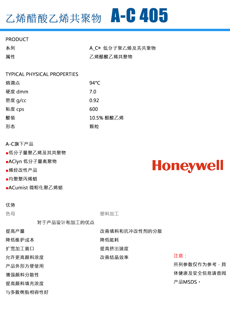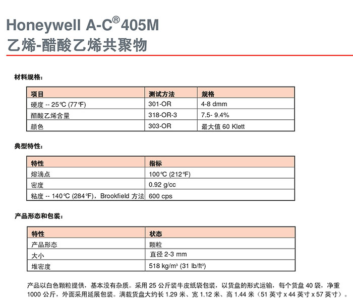 - Honeywell霍尼韋爾 A-C 405M/AC 405M 蠟粉 乙烯-醋酸乙烯共聚物 (EVA) 物性表, Honeywell霍尼韋爾 A-C 405M/AC 405M 蠟粉 乙烯-醋酸乙烯共聚物 (EVA) 產品參數(shù),Honeywell霍尼韋爾 A-C 405M/AC 405M 蠟粉 乙烯-醋酸乙烯共聚物 (EVA) 性能表,Honeywell霍尼韋爾 A-C 405M/AC 405M 蠟粉 乙烯-醋酸乙烯共聚物 (EVA) 出廠報告, MSDS,, 物質安全資料表, UL黃卡,{ SGS報告, RoHS, 食品級認證, NSF飲用水標準, 產品資料, 產品性能, 出廠報告, 原廠原包, 代理商, 熱變形溫度, 熔指數(shù), 流動系數(shù), 抗沖擊性能、沖擊強度, 低溫韌性、低溫抗沖擊性能, 熔體流動系數(shù)、熔體流動速率, 加工工藝、加工參數(shù)、加工溫度, 歐盟RoHS 德國FDA 美國FDA 日本FDA
