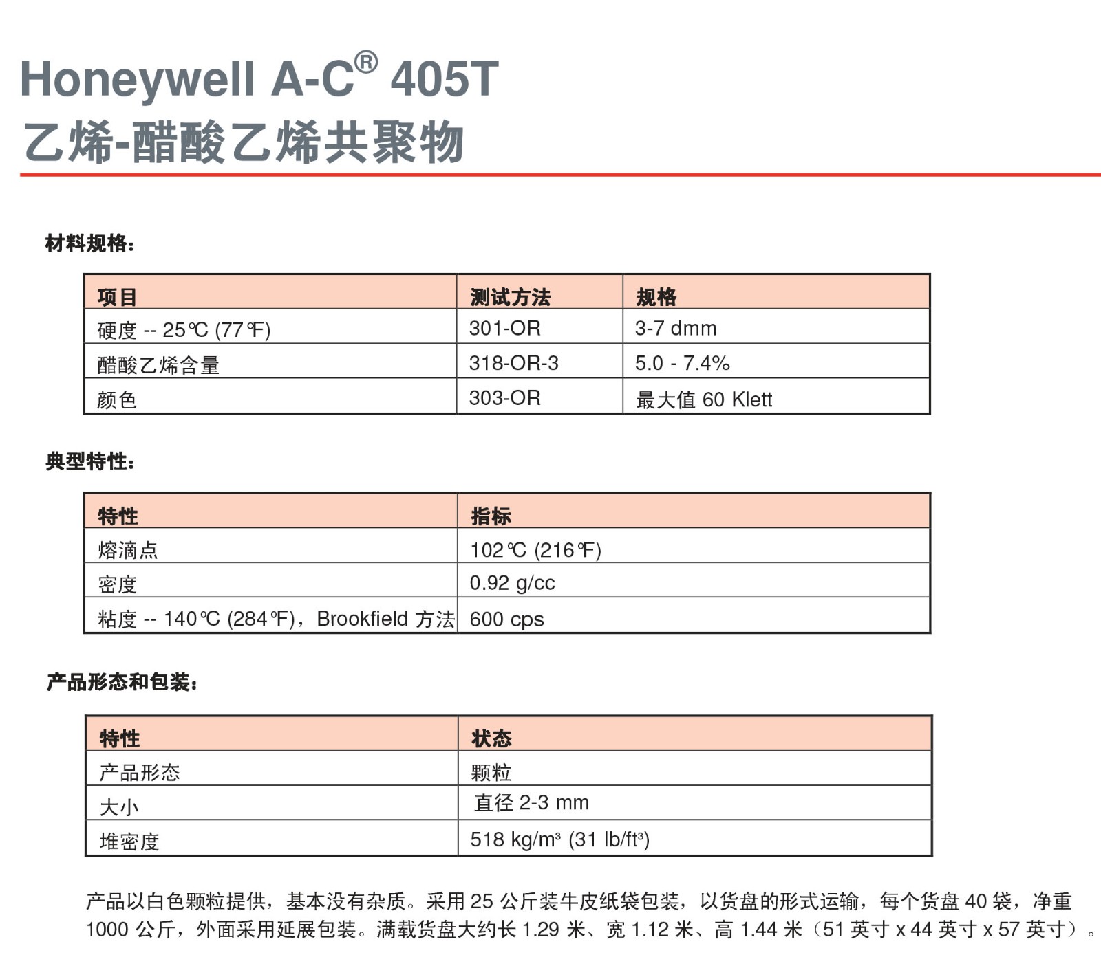 - 霍尼韋爾 HONEYWELL 聚乙烯蠟 A-C 405T 物性表, 霍尼韋爾 HONEYWELL 聚乙烯蠟 A-C 405T 產(chǎn)品參數(shù),霍尼韋爾 HONEYWELL 聚乙烯蠟 A-C 405T 性能表,霍尼韋爾 HONEYWELL 聚乙烯蠟 A-C 405T 出廠報(bào)告, MSDS,, 物質(zhì)安全資料表, UL黃卡,{ SGS報(bào)告, RoHS, 食品級(jí)認(rèn)證, NSF飲用水標(biāo)準(zhǔn), 產(chǎn)品資料, 產(chǎn)品性能, 出廠報(bào)告, 原廠原包, 代理商, 熱變形溫度, 熔指數(shù), 流動(dòng)系數(shù), 抗沖擊性能、沖擊強(qiáng)度, 低溫韌性、低溫抗沖擊性能, 熔體流動(dòng)系數(shù)、熔體流動(dòng)速率, 加工工藝、加工參數(shù)、加工溫度, 歐盟RoHS 德國FDA 美國FDA 日本FDA