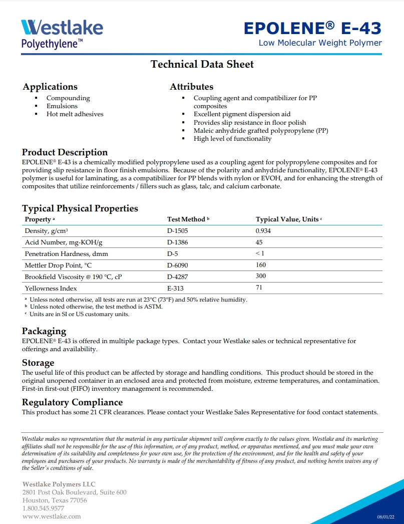 - 西湖化學(xué) E43 Westlake酸酐接枝聚丙烯蠟 EPOLENE E-43 物性表, 西湖化學(xué) E43 Westlake酸酐接枝聚丙烯蠟 EPOLENE E-43 產(chǎn)品參數(shù),西湖化學(xué) E43 Westlake酸酐接枝聚丙烯蠟 EPOLENE E-43 性能表,西湖化學(xué) E43 Westlake酸酐接枝聚丙烯蠟 EPOLENE E-43 出廠報(bào)告, MSDS,, 物質(zhì)安全資料表, UL黃卡,{ SGS報(bào)告, RoHS, 食品級認(rèn)證, NSF飲用水標(biāo)準(zhǔn), 產(chǎn)品資料, 產(chǎn)品性能, 出廠報(bào)告, 原廠原包, 代理商, 熱變形溫度, 熔指數(shù), 流動系數(shù), 抗沖擊性能、沖擊強(qiáng)度, 低溫韌性、低溫抗沖擊性能, 熔體流動系數(shù)、熔體流動速率, 加工工藝、加工參數(shù)、加工溫度, 歐盟RoHS 德國FDA 美國FDA 日本FDA